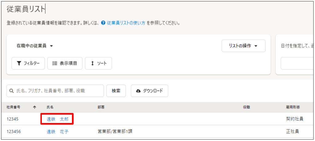 カスタム従業員項目は「従業員リスト」でユーザーを選択することで編集できます。