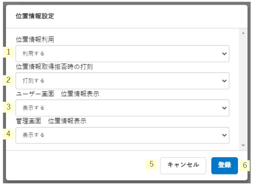 | 1 | 位置情報利用 | 位置情報機能を利用するか選択します ※「利用する」を選択した場合、打刻画面起動時に 位置情報利用の許可がブラウザ上で表示されるようになります |